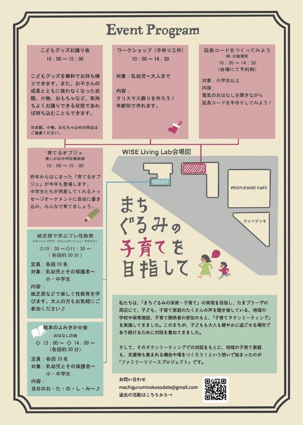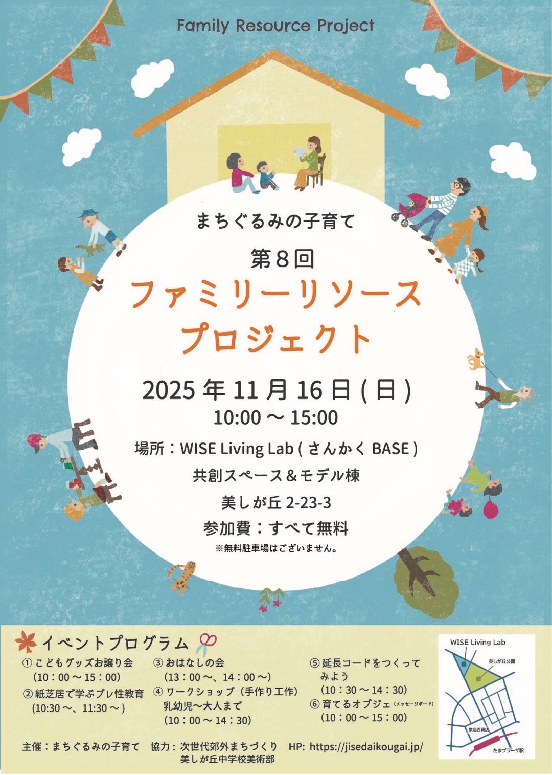 お子さんから子育て中のパパやママ、そして子育てを支えているみなさんが一同に集まれる場として、WISE Living Labの共創スペースを中心に、手作りワークショップ、延長コードづくり、こどもグッズお譲り会、読み聞かせ会や子ども向けの性教育等の企画を実施します。みなさまのお越しをお待ちしています!